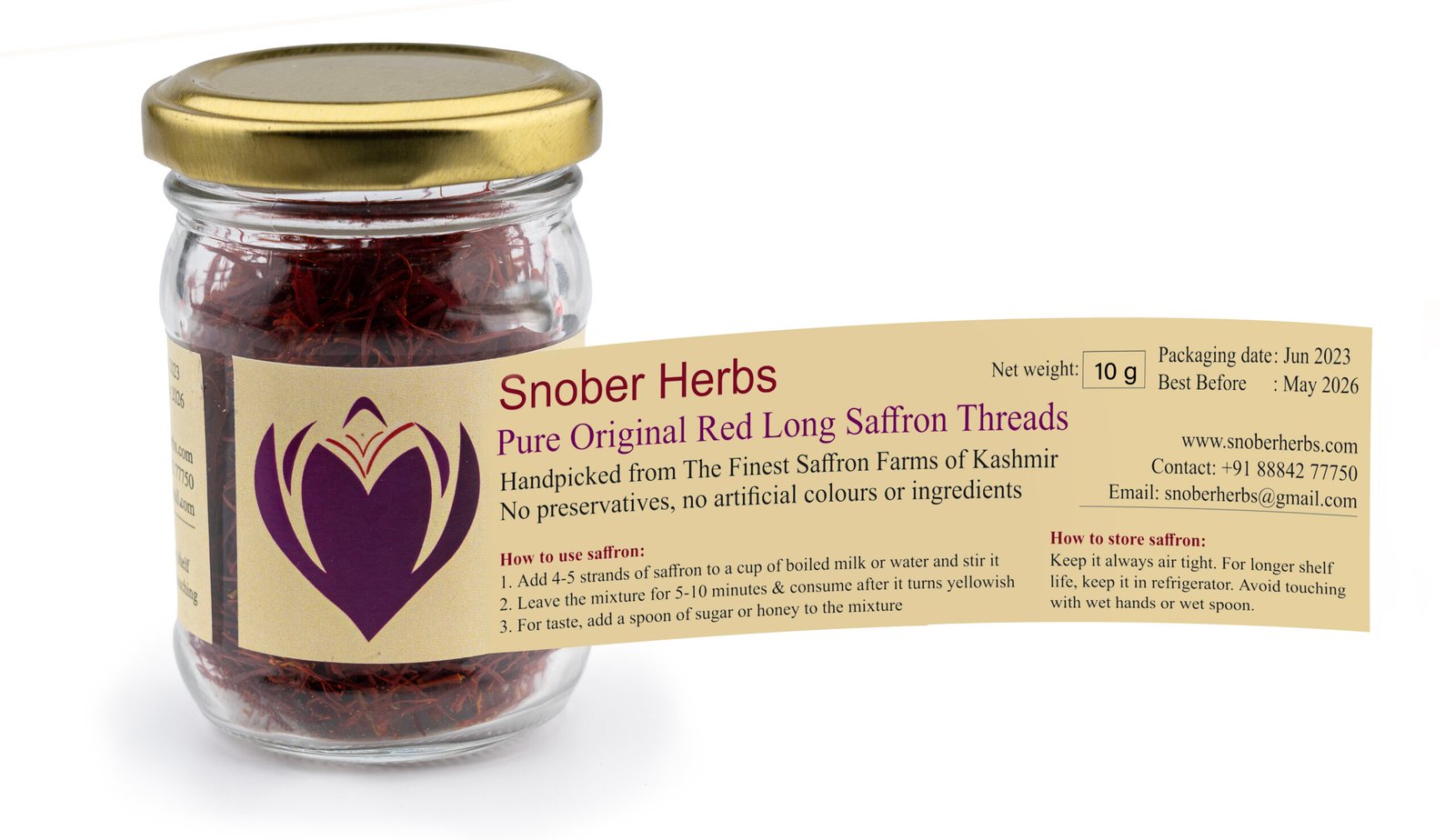 Snober Saffron is 100% pure, organic, non-GMO, and certified by FSSAI, ISO, HACCP, GMP, and Vegan standards. It contains long, deep red strands with a strong natural aroma.