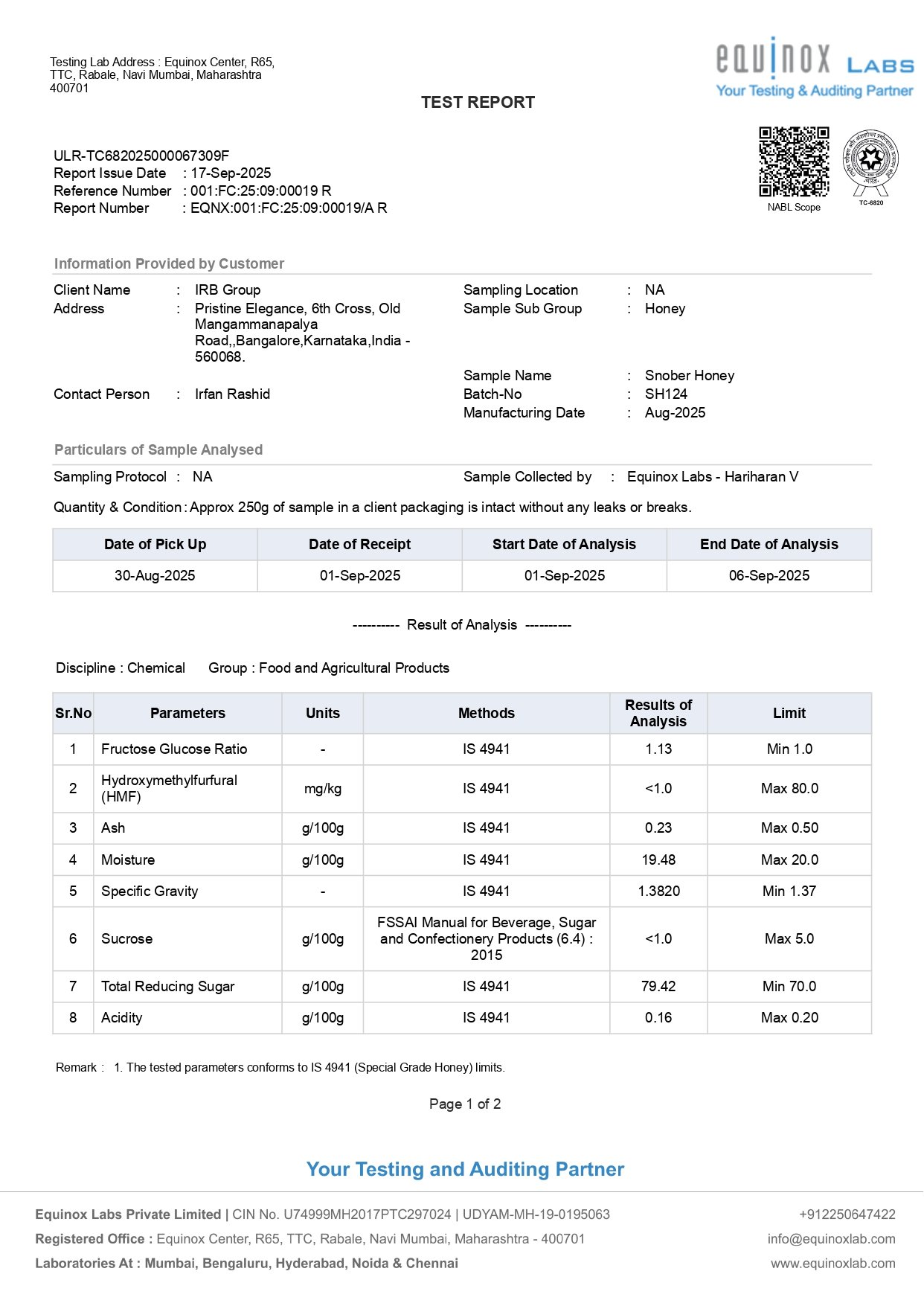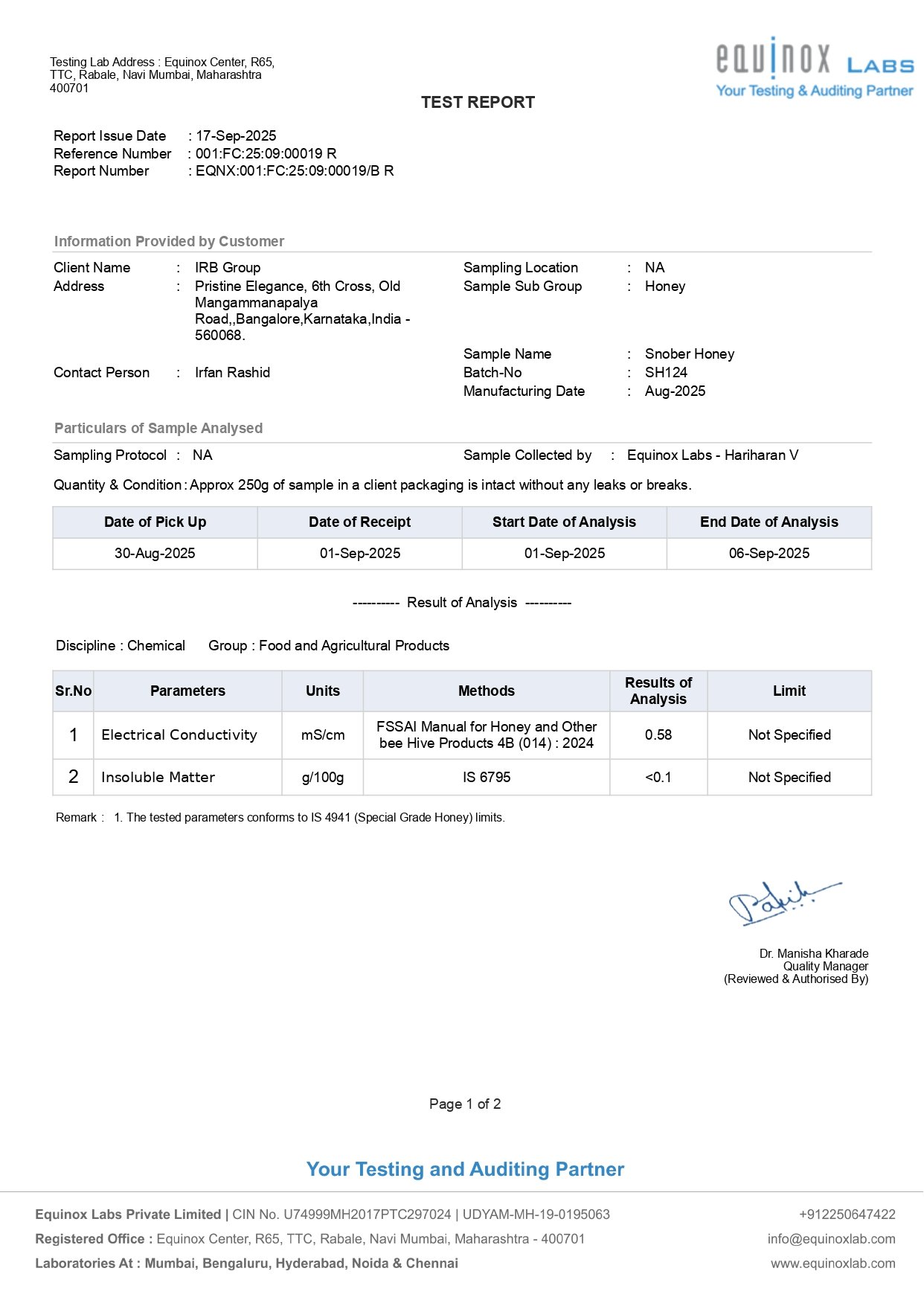 Snober Multiflora Honey is ethically collected from Himalayan beehives and cold-extracted to preserve its natural enzymes, pollen, and antioxidants. Completely free from chemicals, preservatives, artificial colors, or added sugar, it retains its raw integrity and delivers nutrition in its purest form. Every batch is lab-tested and certified by FSSAI, HACCP, GMP, ISO 9001:2015, and is 100% Vegan-approved for quality and authenticity.